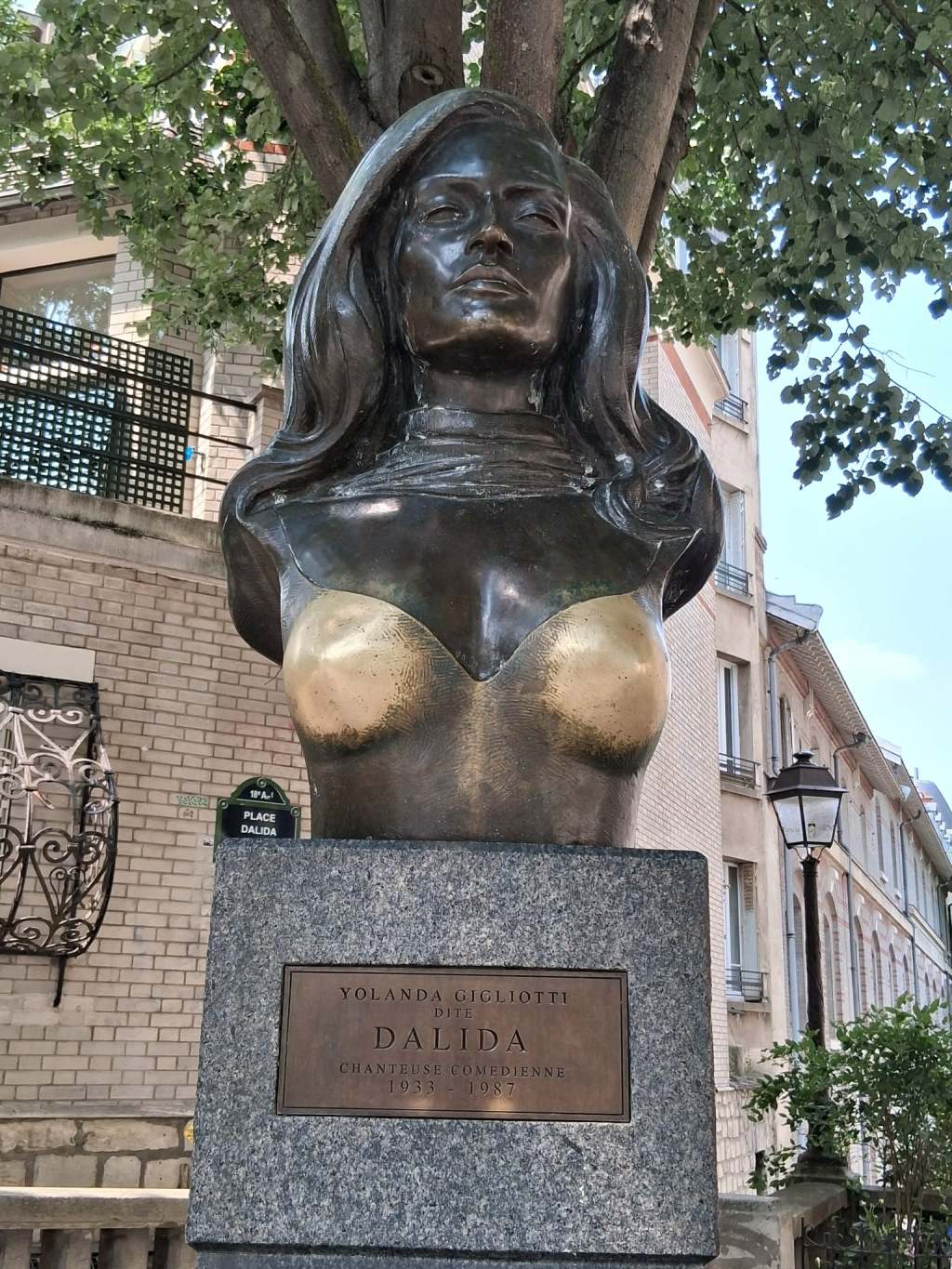 Paris Montmartre, Place Dalida, juin 2025. Je prends une quantité incalculable de clichés de la statue d’une de mes artistes préférées, Dalida. Cette statue en bronze, réalisée en 1997, par le sculpteur Alain Aslan, qui a aussi conçu la statue funèbre sur la tombe de Dalida, est particulière. Elle représente un buste proéminent de Dalida. Après avoir admiré l’œuvre, je m’éloigne un peu et j’observe une dame d’une quarantaine d’années, l’air solennel, se diriger vers le fameux buste. Elle ferme les yeux, comme pour faire une prière, et de ses deux mains touche les seins de la statue. Je me doutais que des adolescents, pour s’amuser, fassent ce genre de chose, mais à ce moment-là, je ressens un certain malaise à voir agir cette femme. Dalida est une diva si importante pour la France, c’est difficile pour moi de considérer que, pour se souvenir d’elle, on empoigne sa poitrine allègrement.